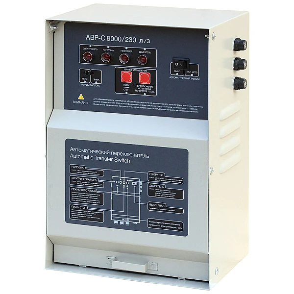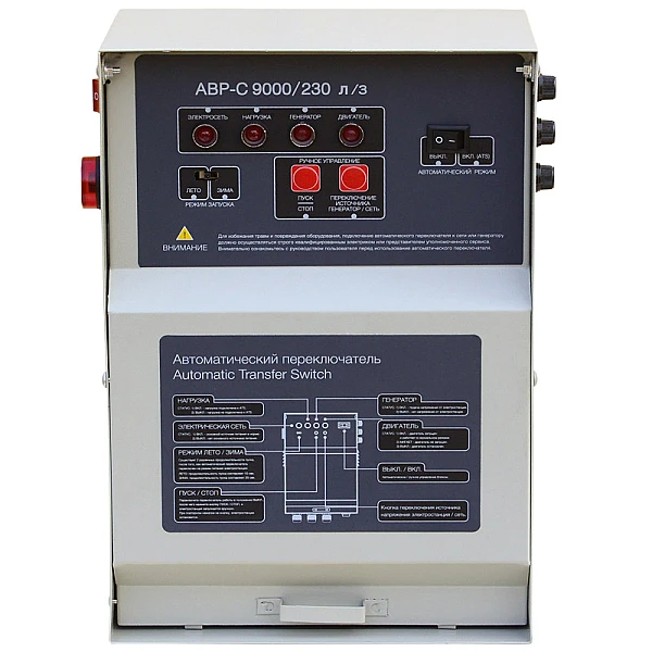 Блок АВР для бензинового генератора от 5 до 9 кВт/230 включает в себя систему автозапуска (автоматического ввода резервного электропитания). При появлении основного источника электропитания происходит отключение электростанции. Блок автоматического управления для контроля наличия напряжения в сети.
