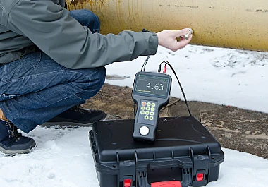 Толщиномер EM1401 UT имеет возможность подключения высокотемпературного датчика EMT14014T, который позволяет измерять толщину горячих объектов, нагретых до 750 градусов по Цельсию. В приборе реализован специальный алгоритм, учитывающий изменение скорости распространения звука в металле от температуры.