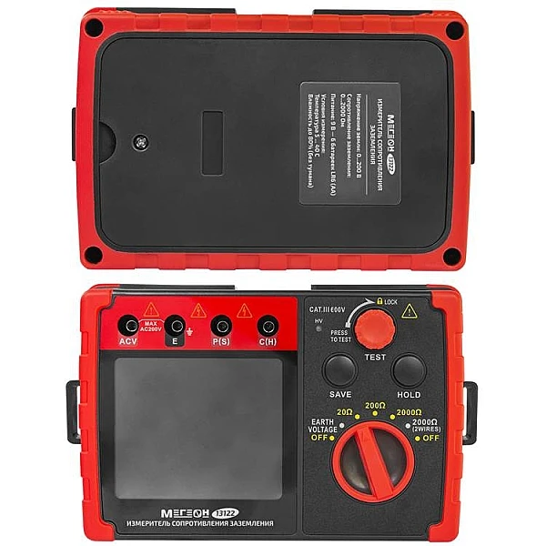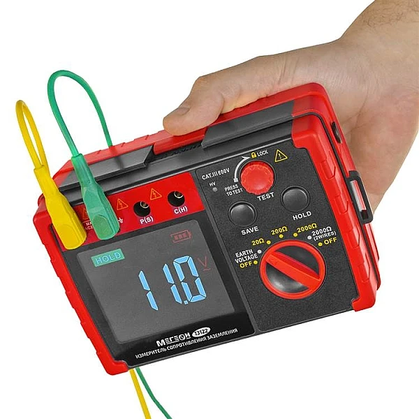 Цифровой прибор МЕГЕОН 13122 используется для определения сопротивления заземления по 2-проводной или 3-проводной схеме. Для дополнительной безопасности изделие оснащено измерителем напряжения земли (шаговое напряжение). Применяется специалистами для диагностики, технического обслуживания и ремонта различных заземляющих систем, электроустановок, распределительных устройств и УЗИП, а также другого электрического оборудования. Диапазоны измерений выбираются вручную. Предусмотрено удержание текущих показаний на дисплее. Модель имеет встроенное хранилище на 20 результатов.