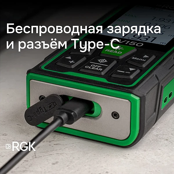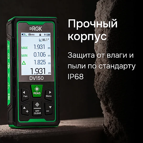 Лазерная рулетка RGK DV150 даже внешне существенно отличается от своих предшественников. Эргономичная форма прибора и рифленая поверхность обеспечивают надежный захват во время работы, а прочный герметичный корпус гарантирует защиту от пыли и водяных брызг по стандарту IP68. В нижнем углу корпуса имеется специальное отверстие для закрепления наручного ремешка.