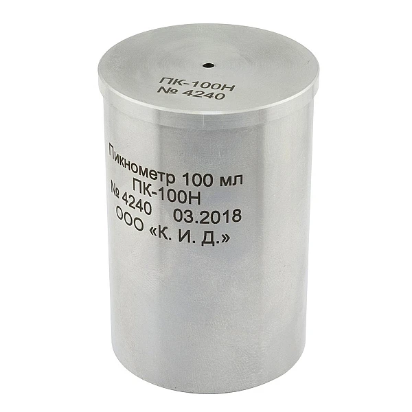 Пикнометр емкостью 100 мл., изготовленный из нержавеющей стали, представляет собой стакан с притертой крышкой, на которой имеется отверстие для выпуска излишков испытуемого материала. Пикнометр изготавливается из твердого алюминиевого сплава с низким коэффициентом температурного расширения.