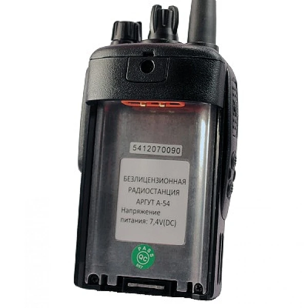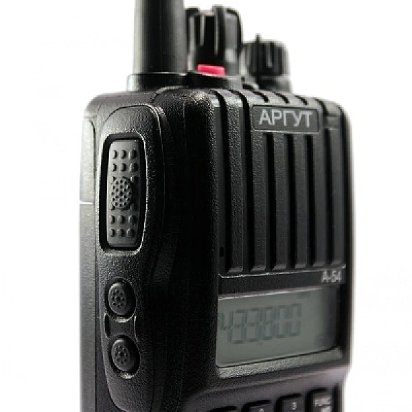 Радиостанция Аргут А-54 предназначена для работы в диапазоне 400-480 МГц. Максимальная мощность 5 Вт, предусмотрена возможность изменения выходной мощности для экономии заряда аккумулятора. Комплектуется Li-ion аккумулятором, емкостью 2300 мАч.