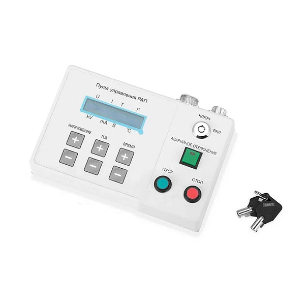 Пульт управления оснащен замком безопасности, что исключает возможность несанкционированного запуска рентгеновского излучения. В верхней части пульта находятся разъемы для подключения к блоку питания и блоку сигнализации. На дисплей пульта управления выводится вся необходимая для оператора информация: напряжение на трубке (U, кВ), анодный ток (I, мА), время экспозиции (T, сек.), температура изолирующего масла (t, °C).