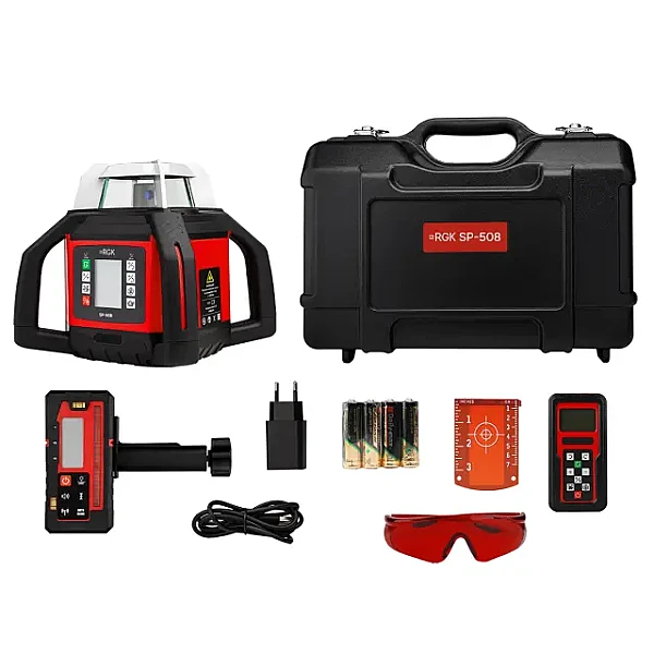 Ротационный нивелир RGK SP-508 — это усовершенствованная версия популярной модели SP-502, сохраняющая все её ключевые преимущества и при этом предлагающая одну принципиально новую функцию — автоматическую ориентацию лазерного луча на приёмник. Эта технология значительно упрощает и ускоряет ряд геодезических и строительных операций, где требуется точное совмещение лазерной плоскости с заданной отметкой. Она не просто упрощает работу, а кардинально меняет подход к выполнению ряда задач: теперь не нужно вручную подстраивать прибор под приёмник — он делает это сам, мгновенно и точно.