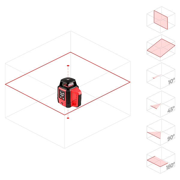 Лазерный уровень RGK SP800 позволяет отстраивать в пространстве горизонтальную и вертикальную плоскость на 360°, а также проектировать точку зенита, для быстрого переноса точки с пола на потолок. В зависимости о вида работ, пользователь может вручную задавать скорость вращения лазерной головки в четырех режимах – 100, 300, 600 оборотов в секунду, а также полностью отключать вращение для проецирования одного луча.