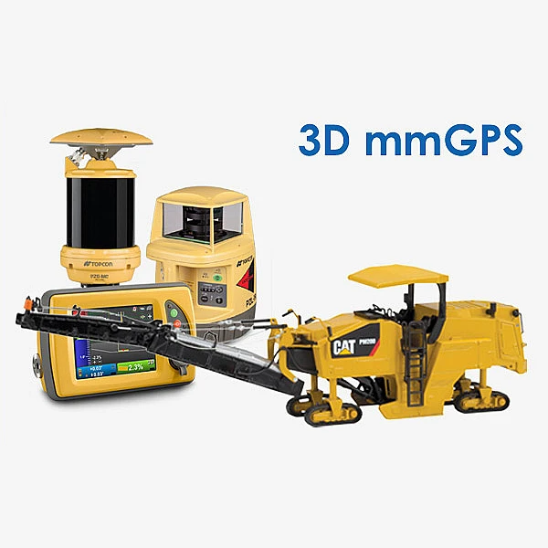 Система mmGPS является одновременно спутниковой и лазерной. Спутниковые приемники на фрезе получают поправки от стационарной базовой станции, находящейся в пределах зоны распространения сигнала. Лазерные сенсоры корректируют высотную отметку, полученную при GPS-измерениях, до миллиметровой точности. При этом построитель лазерной зоны рекомендуется располагать на расстоянии около 125 метров от фрезы для того, чтобы достигать точность не хуже ±5 мм.