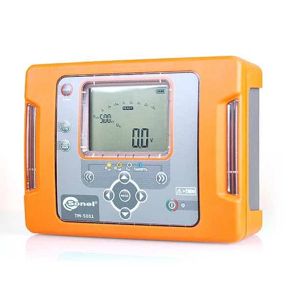TM-5001 — цифровой мегаомметр, предназначенный для измерения сопротивления изоляции кабельных линий, проводов, обмоток трансформаторов, двигателей, других электро- и телекоммуникационных установок. Максимальное измерительное напряжение составляет 5000 В постоянного тока, а диапазон измеряемого сопротивления ограничен величиной в 5000 ГОм. Установка трех интервалов времени позволяет автоматически рассчитывать коэффициенты абсорбции (увлажненности) и поляризации (старения). В процессе измерения сопротивления изоляции прибор отображает величину тока утечки. Функция Ramp test позволяет измерять сопротивления изоляции и напряжения пробоя с шагом до 1 кВ/с.