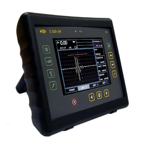 Дефектоскоп УCД-50 имеет цветной TFT матрицей 640х480 идеально подходит для проведения ультразвуковой дефектоскопиии при неразрушающем контроле сварных швов. Мощный и легкий цветной дефектоскоп (масса дефектоскопа с аккумулятором 2 кг) изготовлен в эргономичном ударопрочном корпусе из ABS пластика. УСД-50 устанавливает новый стандарт для современных цифровых дефектоскопов ручного контроля. Дефектоскоп УСД-50 позволяет измерять толщину изделий с большой точностью, выводить сигнал в виде А- и B-сканов и обладает всеми функциями по полному документированию контроля, с поддержкой программы UdReport.
