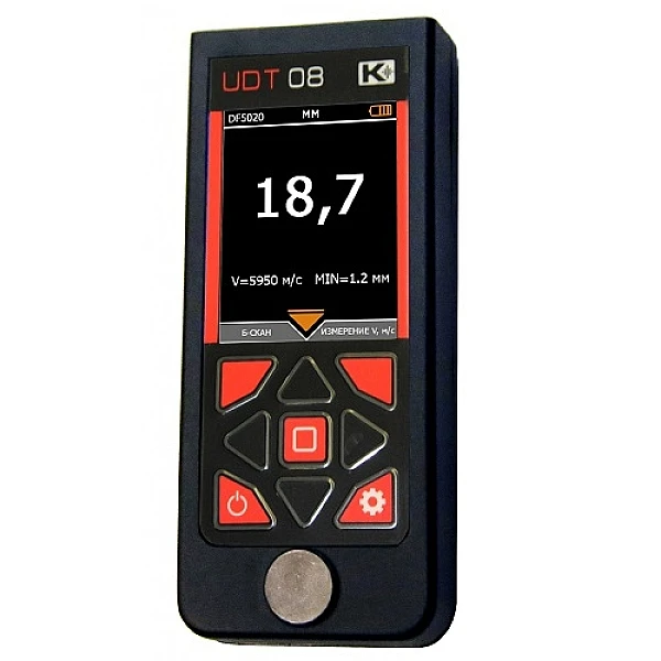Прибор имеет Б-скан для построения профиля сечения исследуемой детали, с фиксацией минимального значения толщины. Прибор обладает высокой точностью и надежностью, а цветной морозостойкий TFT экран делают его одним из лучших в своем классе по соотношению цена / качество. Ультразвуковой толщиномер УДТ-08 соответствует требованиям ГОСТ 28702-90.