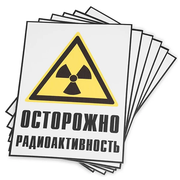 Знак радиационной опасности «Осторожно радиоактивность» носит предупреждающий характер и создан для обозначения объектов, мест или зон, имеющих потенциальную или реальную угрозу пагубного воздействия радиоактивных частиц. Выполнен из пластика. Размер знака 200 × 270 мм.